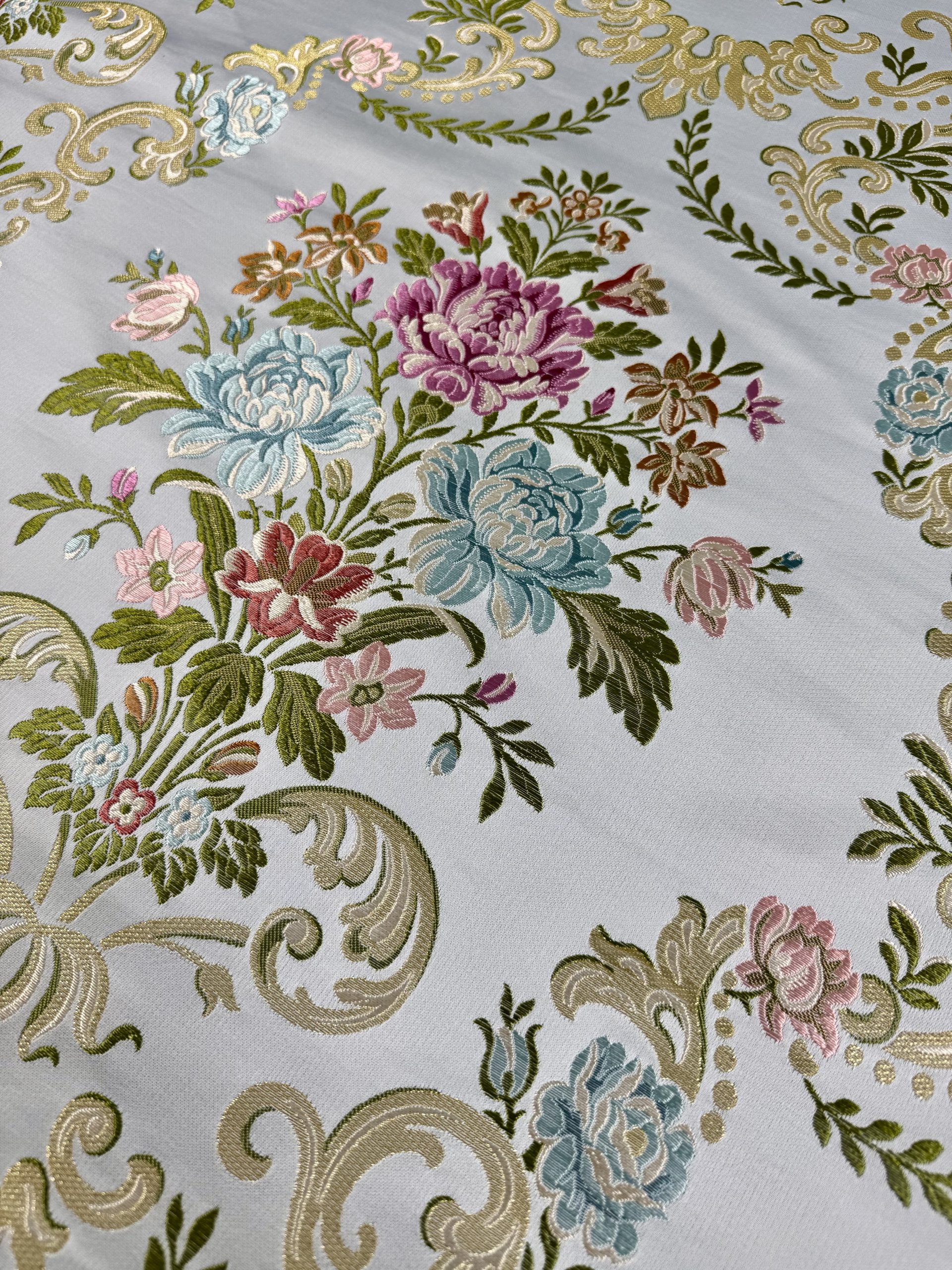 Perfecto corte de tela fallera Velázquez para fallera, indumentaria tradicional festiva, aplicación en moda y en liturgia.